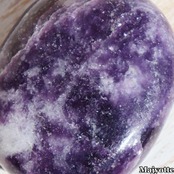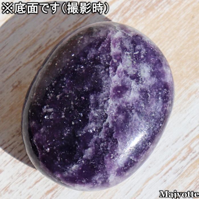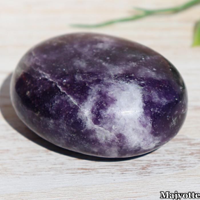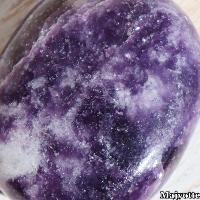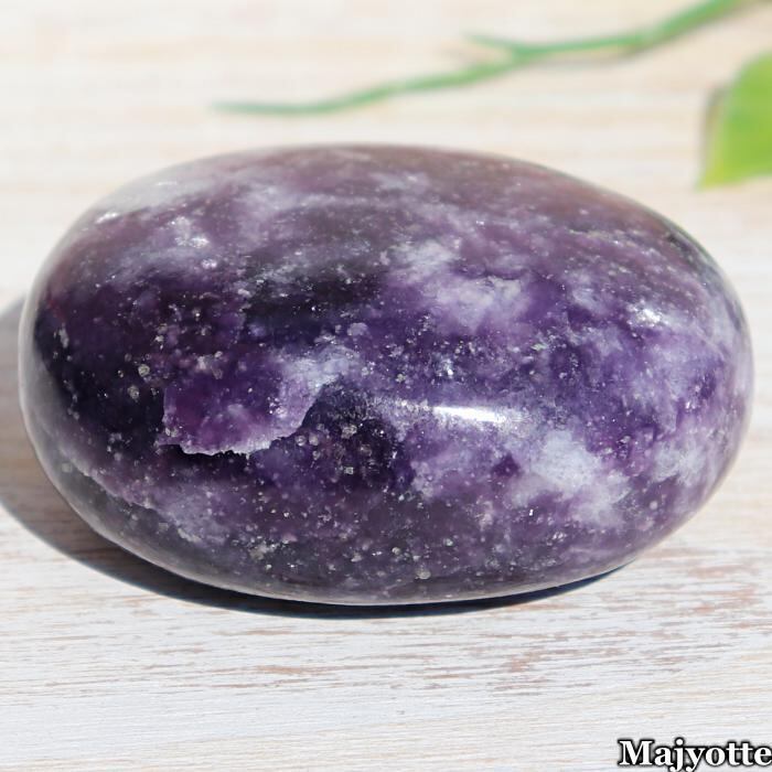 ★紫色が特徴的なレピドライトは無数の小さなきらめきが特徴の石です。マイカ(雲母)の一種で トルマリンなど他の石と共生して産出されることが多く リチウムの含有量によってピンク色・紫色・白色などの様々な顔を持ちます。鱗状の結晶で採掘されることが多く剥離しやすい性質も特徴の一つです。透明度があまり高くない紫色のものが多い天然石ですが 透明度が高く中が見えるものはとても珍しく人気があります。こちらのアイテムは濃い紫色の中に奇麗な白色が映える逸品です。覗き込むとレピドライトの中が見える箇所もあります。