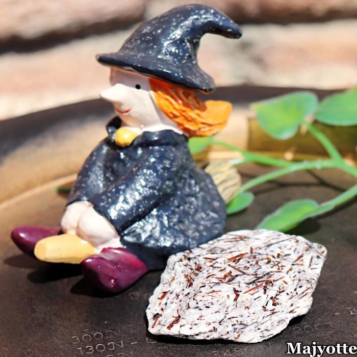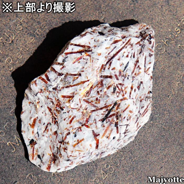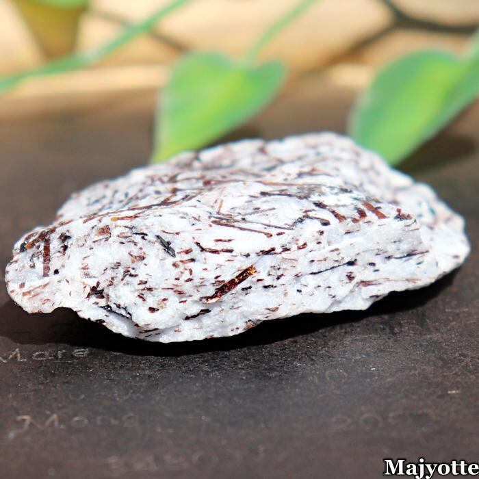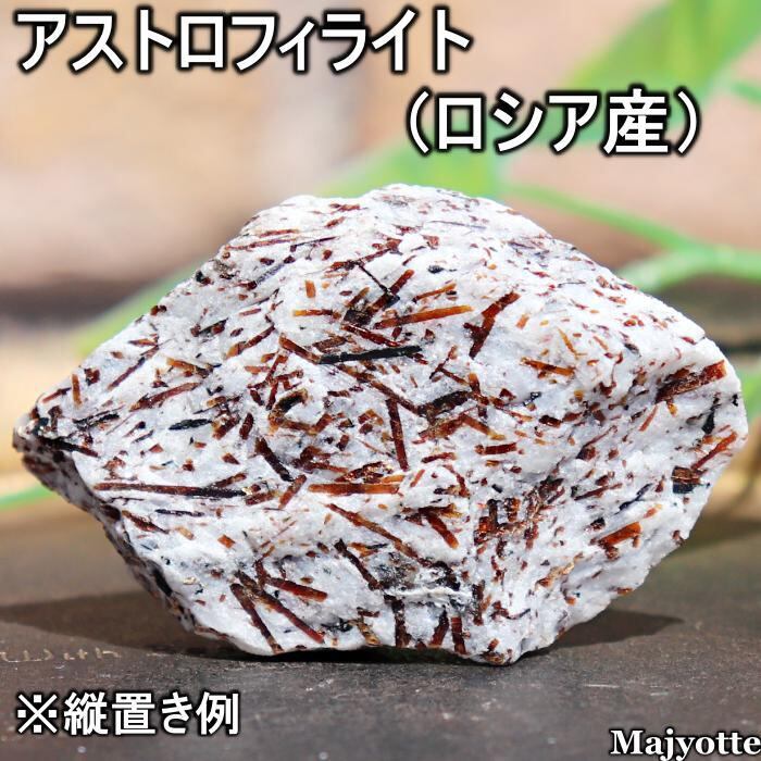 ★アストロフィライトという名前はギリシア語で「星」を意味する「アストロ(Astro)」と、「葉」を意味する「ピュッロン(Phyllon)」が由来の天然石です。特徴としては結晶が白い母岩(ペグマタイト)の上に銅色の結晶が葉のような細い短冊状に形成されます。細かな結晶が宇宙で生まれたビッグバンを想像させると言われ、「創造の爆発」とも言われています。こちらのアイテムは母岩(ペグマタイト)に奇麗なアストロフィライトが共生した原石です。