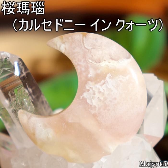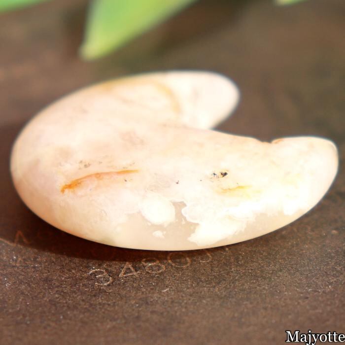 ★桜瑪瑙と呼ばれているカルセドニーです。カルセドニーの中にある石英の結晶が桜の花のように見える石です。店長は仕入れ時に『目の前が明るくなる。』そんな印象を受けたと話していました。三日月の形をした可愛い桜瑪瑙です。