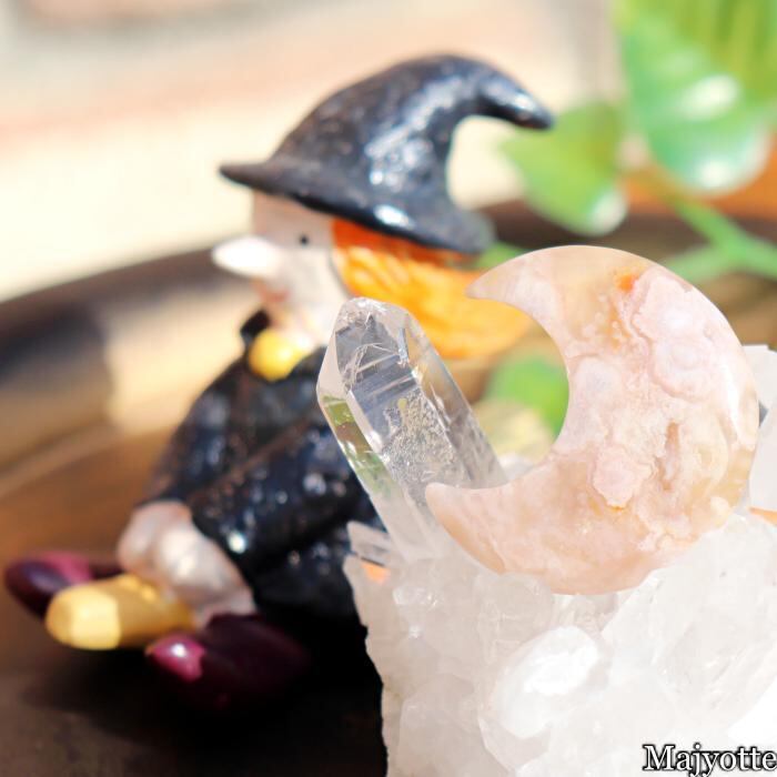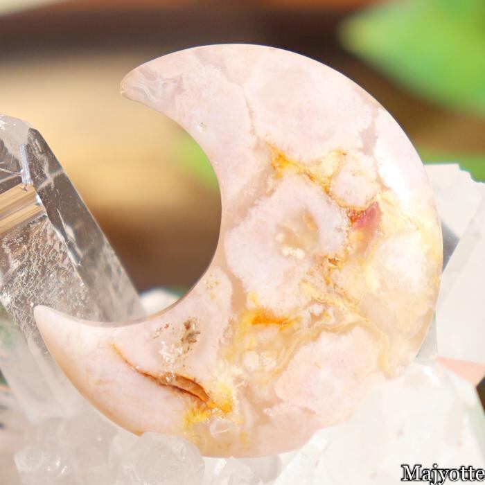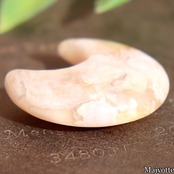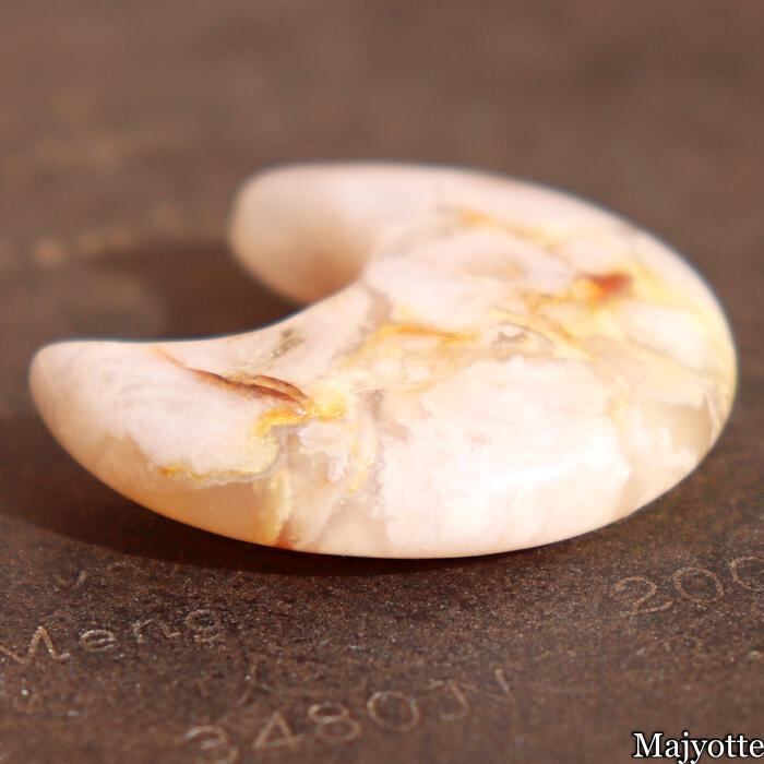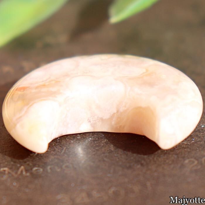 ★桜瑪瑙と呼ばれているカルセドニーです。カルセドニーの中にある石英の結晶が桜の花のように見える石です。店長は仕入れ時に『目の前が明るくなる。』そんな印象を受けたと話していました。三日月の形をした可愛い桜瑪瑙です。